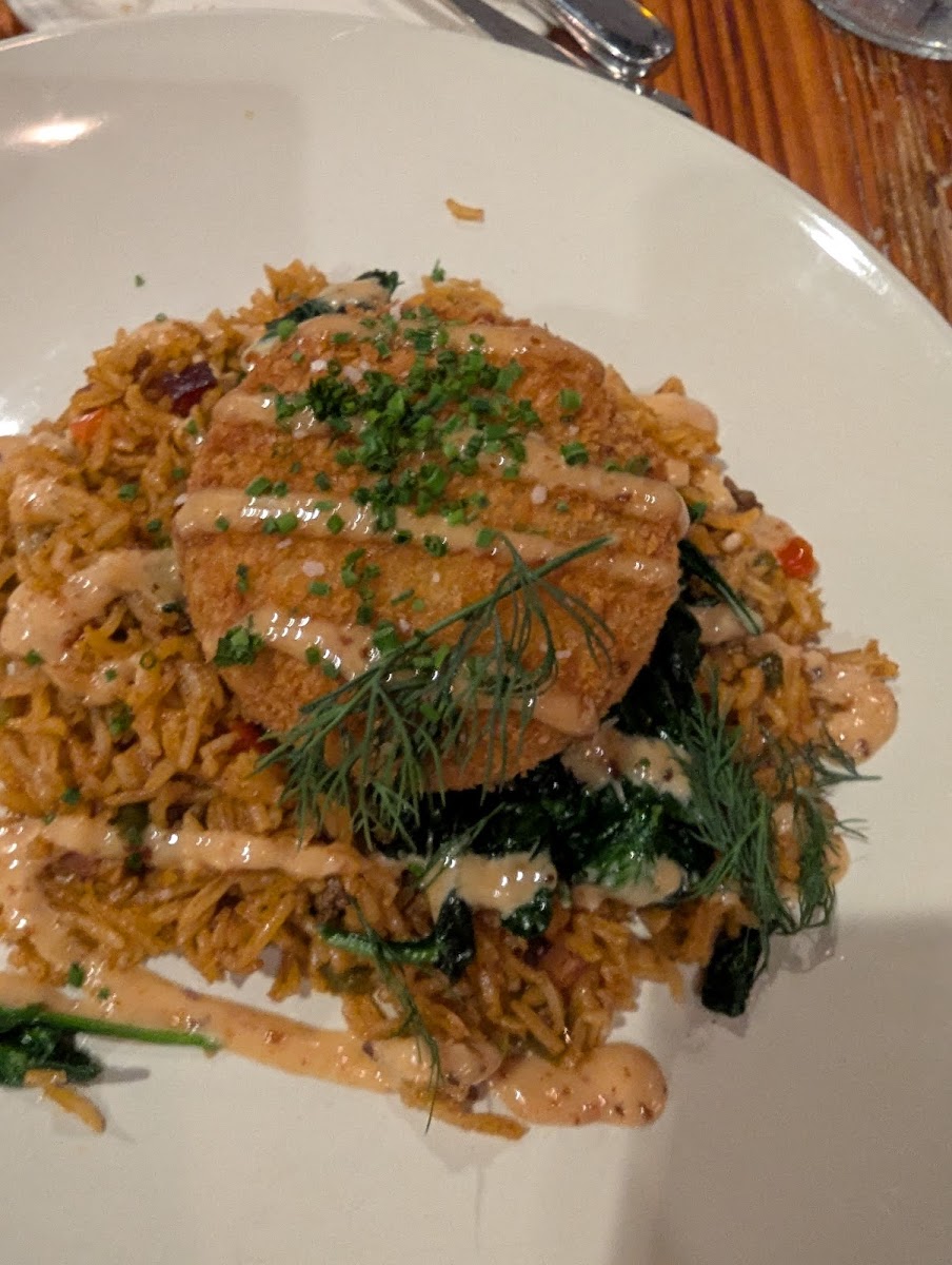 My husband and I went to the Foodbar for date night. Upon being seated at the smallest table in the restaurant, we could hardly hear each other or the waitress. The environment was very loud. It probably didn't help how close each table is set up to the next. With that said, the service was good but the star of the show is definitely the food. We had oysters on the half shell for apps. They were fresh and the cocktail sauce was amazing. My husband got the coq au vin. He said it was good. I ordered the crab cakes. It was delicious! Packed full of real crab meat- no fillers. It was paired nicely with dirty rice and wilted spinach. I would order the food to-go next time and skip dining in.